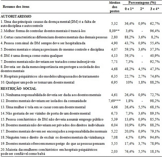 A Tabela 2 apresenta os resultados referentes às subescalas de Autoritarismo e de Restrição Social. No que se refere à primeira, a afirmação de que "a melhor forma de controlar os doentes mentais é trancá-los" (item 2; média dos postos = 8,09) foi, significativamente, a que mais contribuiu para as atitudes dos entrevistados nessa subescala (χ² = 379,394; p < 0,001). Com relação à ocorrência de atitudes positivas, a maioria dos sujeitos (96,4%) discordou de que "a melhor forma de controlar os doentes mentais é trancá-los" (item 2) e 92,7% concordaram que "doentes mentais não deveriam ser tratados como indesejáveis" (item 7). No que diz respeito à ocorrência de atitudes negativas, 88,2% concordaram que "certas características diferenciam os doentes mentais das demais pessoas" (item 3). Por outro lado, dois itens dividiram as opiniões dos entrevistados, apresentando porcentagens semelhantes de respostas indicativas de atitudes positivas e negativas. No que se refere ao primeiro (item 4), 55,4% discordaram e 43,7% concordaram com a afirmação de que "a pessoa com sinal de doença mental sempre deve ser hospitalizada". Quanto ao segundo (item 8), 48,2% dos entrevistados discordaram e 47,3% concordaram com a afirmação de que "deve ser dada menos importância em proteger a sociedade dos doentes mentais".