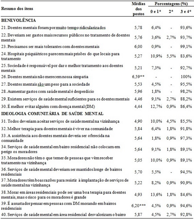 Na subescala de Ideologia Comunitária de Saúde mental, o teste de Friedman mostrou que a afirmação de que "é assustador pensar em pessoas com doença mental morando em bairros residenciais" (item 39; média dos postos = 6,20) foi, significativamente, a mais importante para as atitudes dos entrevistados nessa subescala (χ² = 42,067; p < 0,001). Os resultados indicaram atitudes positivas da maioria dos entrevistados, sendo que 97,3% dos sujeitos concordaram que "a assistência aos doentes mentais deveria ser oferecida na comunidade" (item 33); 94,5% discordaram que "os serviços de saúde mental deveriam ser mantidos longe de bairros residenciais" e 94,6% discordaram que "é assustador pensar em pessoas com doença mental morando em bairros residenciais" (item 39) (Tabela 3).