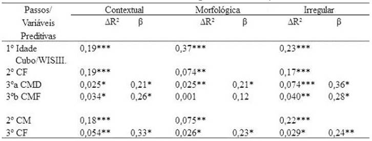 Para compreender se a consciência morfológica tem uma contribuição maior do que a fonológica na escrita foram realizadas novas análises de regressão hierárquica. Assim, para verificar a influência da consciência fonológica para cada variável de escrita (palavras com regras contextuais, palavras com regras morfológicas e palavras irregulares) alterou-se a ordem da entrada das variáveis. Cada uma das regressões hierárquicas de ordem fixa foi realizada com os seguintes passos: 1º passo - idade e cubo/ WISCIII; 2º passo - consciência morfológica derivacional e flexional e 3º passo - consciência fonológica.