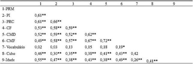 As médias e os desvios padrões de todas as medidas usadas são apresentados na tabela 1. Os dados de cada distribuição foram conferidos quanto à normalidade, através da divisão dasskewnesspelo desvio padrão do erro (Fidel, 2009). Essa verificação mostrou que a distribuição da ortografia de palavras com regras contextuais, consciência fonológica, vocabulário e cubo tiveram problemas naskewness, -6, 47, -2,2, 2,4 e 4,4, respectivamente. Para resolver o problema, usamos a transformação logarítmica, Ln (valor máximo + 1- escores da variável), nas distribuições assimétricas negativas, e a transformação por radiciação (√ escores da variável), nas assimétricas positivas (Field, 2009). Em todas as análises foram usadas as variáveis transformadas.