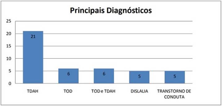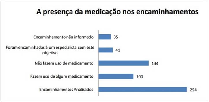 A análise dos encaminhamentos revelou que de 254 crianças, 65 receberam diagnóstico, sendo os mais recorrentes o Transtorno de Déficit de Atenção e Hiperatividade (27) e o Transtorno Opositivo Desafiador (12). Entre estes, 6 crianças receberam os dois diagnósticos. Independente de diagnóstico médico, 100 crianças fazem uso de psicotrópicos, sendo que, entre os 144 alunos encaminhados que não faziam uso de medicamentos, 41 foram encaminhados à especialistas com esta finalidade. Os medicamentos com maior número de prescrições foram Carmazepina, Ritalina e Risperidona.