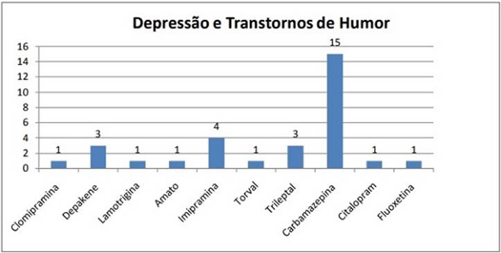 No quadro 5 há uma lista com os principais medicamentos prescritos para Depressão e Transtorno de Humor. No entanto, cabe frisar que o medicamento Carbamazepina, de acordo com a Agência Nacional de Vigilância Sanitária (ANVISA), tem eficácia terapêutica no tratamento de determinados tipos de crises convulsivas (epilepsias), além de determinadas condições psiquiátricas (episódios de mania de distúrbios do humor bipolar e certo tipo de depressão). Neste contexto, também se destaca a eficácia deste medicamento no tratamento da agressividade, trazendo a redução do comportamento agressivo e impulsivo.