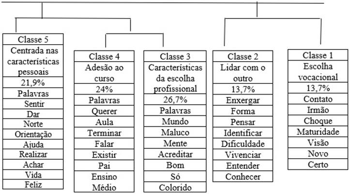 A Figura 1 apresenta as classes obtidas na análise. A Classe Central denominadaConhecimento para a escuta do outrofoi desmembrada em duas classes:Escolha vocacional(Classe 1) com 13,7% de comentários; aponta aspectos considerados relevantes para a maturidade psicológica na escolha do curso relacionados com experiências pessoais com as dificuldades do outro ou de si. Os elementos que compõem esta classe mostram a busca da compreensão com a dinâmica do psiquismo, exemplificado no comentário "No meu caso a escolha para Psicologia foi um caso particular. Na verdade, o meu irmão é esquizofrênico e aquilo me tocou muito, me incomodou muito"(participante 5) e "Gostei de fazer Psicologia, era um sonho meu, e na minha adolescência eu passei por uns problemas, mais emocionais. Assim, eu fazia terapia, então eu via como era tão bom"(participante 12). Outra classe foi denominada deLidar com o outro(Classe 2) que também apresentou 13,7% dos comentários, mostrando que a concepção de maturidade psicológica para a escolha do curso de Psicologia está relacionada à representação do outro nas singularidades por meio de processo de escuta diferenciada compreendida como ferramenta essencial do psicólogo. O processo de escuta não é aleatório, mas obtido por conhecimento durante a graduação. "Você pode dar uma orientação, você pode parar para ouvir e você direciona a pessoa"(participante 9) e"Busca ao conhecimento do outro. Assim a curiosidade de entender, de conhecer mais."(participante 3). A maturidade para a escolha do curso de Psicologia envolve o investimento em conhecimento para aprender sobre as diferenças.