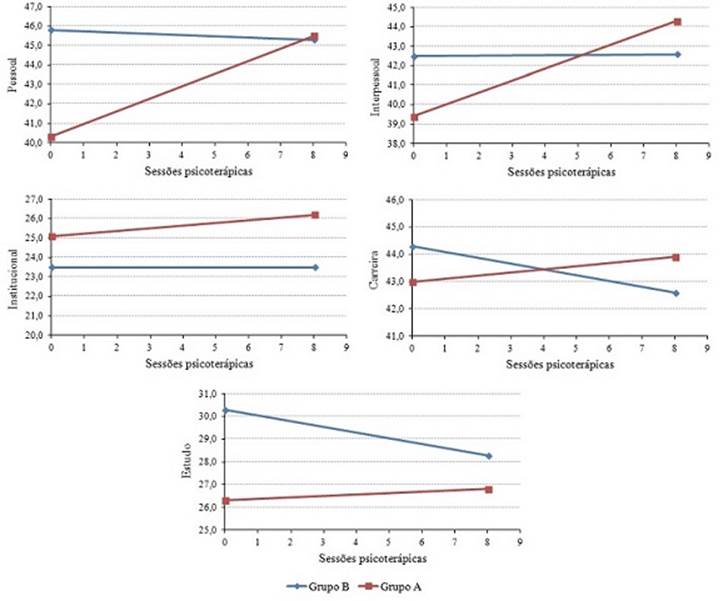 De modo geral, nas dimensões Carreira, Estudo e Institucional, após a psicoterapia de grupo, foi observada uma variação positiva nas médias do grupo A (0,9; 0,5; 1,1 pontos, respectivamente), enquanto no grupo B houve diminuição (-1,7; -2,0 pontos) e na dimensão institucional se manteve igual (Figura 1). O sucesso acadêmico do aluno se inicia com o bom êxito no processo de adaptação e com a psicoterapia, conforme aponta Ferreira (2009), indicando que esta pode oferecer condições para que o estudante desenvolva seu potencial pessoal e acadêmico, trabalhando direta ou indiretamente questões relacionadas com as vivências acadêmicas, o que engloba questões das dimensões institucional, carreira e estudo.