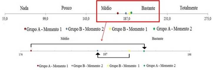 Ao posicionar-se às médias dos grupos A e B nos dois momentos em que foram avaliados na escala elaborada, observou-se que o grupo A no momento 1 estavamédio adaptadoe no momento 2 progrediu tornando-sebastante adaptado. Enquanto no grupo B, o resultado foi inverso, debastante adaptado,no momento 1, regrediu tornando-semédio adaptadono momento 2.Essa observação aponta um movimento crescente do grupo A e decrescente do grupo B em direção à adaptação acadêmica (Figura 2).