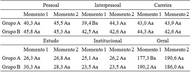 Em relação ao processo de adaptação acadêmica, na sua totalidade, foi possível observar (tabela 1) que as médias dos grupos A e B, no início do estudo, não eram significativamente diferentes, mesmo sendo a média do grupo B maior que a do grupo A. Esse resultado pode ser justificado pela forma de seleção da amostra, que foi realizada mediante um sorteio entre os participantes que se voluntariaram para frequentar a psicoterapia. No momento 2, as médias dos grupos A e B, não apresentaram diferenças significativas. Observou-se ainda que a percepção do grupo B acerca de sua adaptação acadêmica não diferiu significativamente, apesar de ter apresentado redução. Entretanto, no grupo A, encontramos diferença significativa de elevação da percepção sobre a adaptação acadêmica, após a participação em psicoterapia de grupo (tabela 1), evidenciando que a mesma favoreceu a adaptação acadêmica.