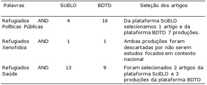 A partir da busca booleana, usando somente o descritor "refugiados" na Plataforma BDTD, foram encontradas 96 dissertações de mestrado e 33 teses de doutorado. No SciELO, também com o uso do descritor "refugiados", foram encontrados 164 artigos, e cruzando-se "refugiados" e "políticas públicas", quatro artigos. Destes, apenas um foi incluído no estudo. Na plataforma BDTD, combinando-se os descritores "refugiados" e "políticas públicas", foram encontradas 16 produções. Destas, apenas sete foram incluídas no trabalho. Ao combinar o termo "refugiados" com "xenofobia", encontrou-se, nas duas plataformas, apenas uma produção em cada termo. Ambas foram descartadas por não tratarem do problema da xenofobia no contexto nacional. Ao combinar o descritor "refugiados" com o descritor "saúde" foram encontrados 13 artigos na plataforma SciELO e nove produções na Plataforma BDTD. Foram incluídas no estudo três produções da plataforma BDTD e duas produções da plataforma SciELO.