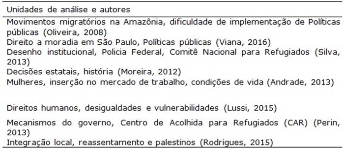 Na leitura preliminar foram encontrados artigos, dissertações de mestrado e teses de doutorado, publicados entre 2007 e 2017, de diferentes áreas que extrapolam os objetivos do estudo, mas que tratam do tema "refugiados". A diversidade das áreas envolvidas nos temas da literatura sobre o fenômeno da migração também deve ser levada em consideração como um aspecto relevante sobre o modo como os estudos abordam as políticas públicas.