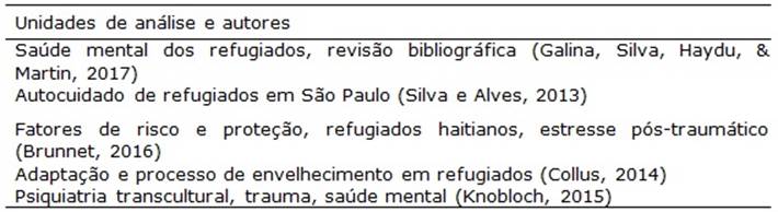 Galina et al. (2017) apresentam uma revisão bibliográfica de artigos internacionais sobre a saúde mental de refugiados, onde se destaca a importância das redes de apoio social e da organização dos sistemas de saúde dos países acolhedores como fatores que diminuem o sofrimento psíquico dos refugiados. Quanto à saúde mental de jovens e crianças, ressalta-se o nível de organização das famílias e o amparo educacional e acadêmico como fatores que promovem saúde mental. Os autores também destacam a importância do preparo dos profissionais de saúde em lidar com a interculturalidade. Vale ressaltar que o cruzamento dos termos refugiados e xenofobia não apresentou nenhum resultado de publicação.
