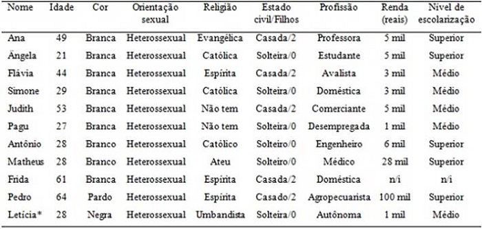 O recrutamento aconteceu por meio da rede contatos pessoais dos pesquisadores. Após contato inicial com cada participante foi marcado um encontro para explicar os objetivos da pesquisa e agendar a entrevista em local reservado para preservar o sigilo e a privacidade. As entrevistas foram realizadas individualmente entre novembro de 2018 e fevereiro de 2019 pela primeira autora deste artigo e foram gravadas em áudio e transcritas na íntegra. Os nomes dos participantes foram substituídos por nomes fictícios. Esta pesquisa foi aprovada pelo Comitê de Ética em Pesquisa da Universidade Federal do Triângulo Mineiro, CAAE n. 79690717.8.0000.5154.
