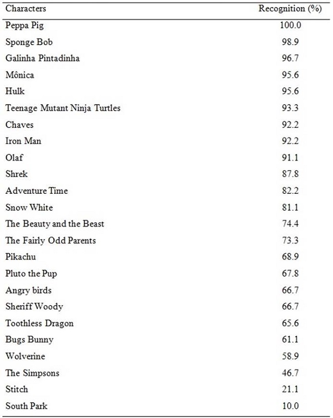 Table 1 shows the percentage of children who recognized the characters. Some characters used in the study are part of television programs intended for audiences over 12 years. The Simpsons, for example, a TV program with a 12-year national indicative rating, earned a recognition rating of 46.75%. South Park, with a 16-year indicative rating showed a 10% recognition level, indicate that some children are having access contents considered inappropriate for them.