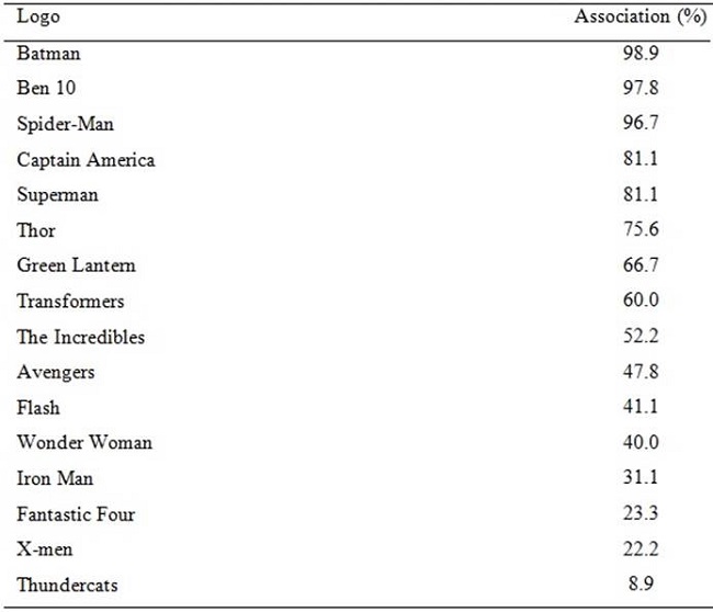 Table 2 shows the proportion of children's recognition of logos varied from 8.9% (Thundercats) to 98.9% (Batman). On average the scores were lower than the indexes of recognition of the characters.