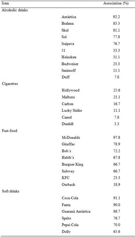 Tobacco products achieved the lowest index of association, with Hollywood (25.6%) and Malboro (21.1%) as the highest. These findings were expected and corroborate previous studies (Borzekowski & Cohen, 2013), however, unlike what was observed in the study by Fischer et al (1991), the recognition of cigarette brands was much lower than the recognition of logos and child characters in general. In 2011 Brazil adopted international recommendations for the regulation of tobacco products advertisement (Teixeira, Paiva, & Ferreira, 2017), so that, tobacco products advertising is limited to display of products at sales points (Portes, Machado, Turci, Figueiredo, Cavalcante, & Silva, 2018), it is possible to say that these governmental and societal actions have produced positive results, as shown in Table 3.