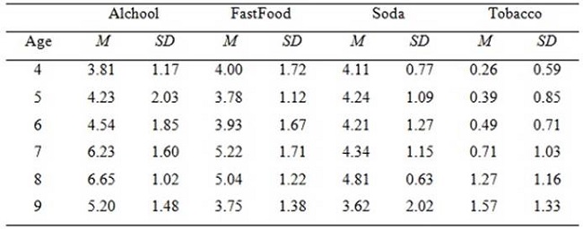 In this research, possible differences between ages for the variables used in the present study were investigated, seeking to explore the existence of differences between ages for the recognition of brands. To assess these differences, ANOVA was performed considering age as a fixed factor. As Table 4 points out, the average of recognitions increased regarding age for brands of Alcohol related products up to 8 years old, obtaining a reduction in children aged 9 years old. This finding may be related to the number of 9-year-old children being less representative in the sample than the other age groups. For fast food and soft drinks, close averages were observed among the age groups, showing a significant increase in children aged 7 and 8 years. This can be described as a corroboration of McNeal's theory of consumer behavior described earlier in this study.