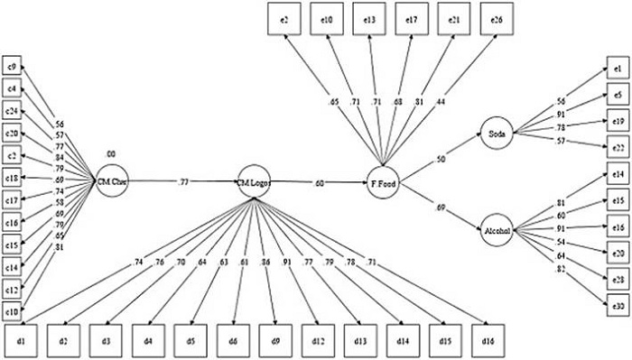 ABSTRACT: This research aimed to investigate relationships between the recognition of children's characters, and the association of logos and brands of tobacco products, fast-food, soft drinks and alcoholic beverages in 90 children, aged 4-9 years, from the city of Rio de Janeiro, most of whom are male (56.7%). Age range was chosen based on McNeal's model of consumer behavior which says the consumer is fully formed by the age of 8. The Instrument for assessing Cartoon and Movie Characters(IACMC, α= 0.80,M=0.75,SD=0.16), the Instrument for assessing Cartoon and Movie Logos (IACMLα=0.80,M=0.58,SD=0.21) and the Instrument for Assessing Logos and Trademarks Association (IALTA,α=0.74,M=0.53,SD= 0.14) were used. The global scores for recognition of logos correlated significantly with the global scores for recognition of children's characters (r= 0.38,p< 0.01). The model path was drawn from characters to logos and from logos to fast food associations. A direct effect was drawn from fast food over soda and alcohol. Fit wasX²(df= 736) = 782.97 (p= 0.112), RMSEA = 0.03 (90% C.I. [0.00, 0.04]) (p= 0.996), CFI = 0.95, TLI = 0.94. The research demonstrated the need for stricter regulations for the advertising of alcoholic beverages, soft drinks and fast-food.