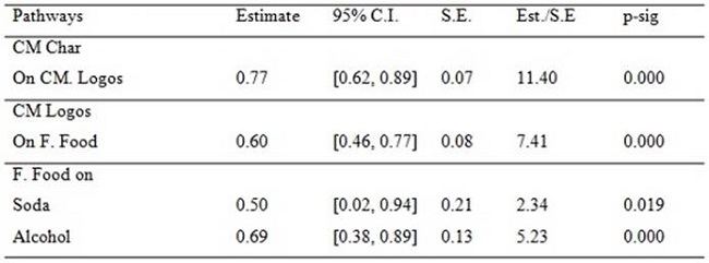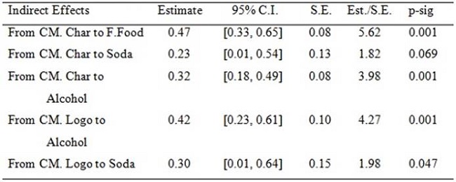 Indirect effects indicate that recognizing characters increased successful associations for both fast food and alcohol, but not for soda. Recognizing character logos also led to higher scores on alcohol and soda as displayed on Table 6.