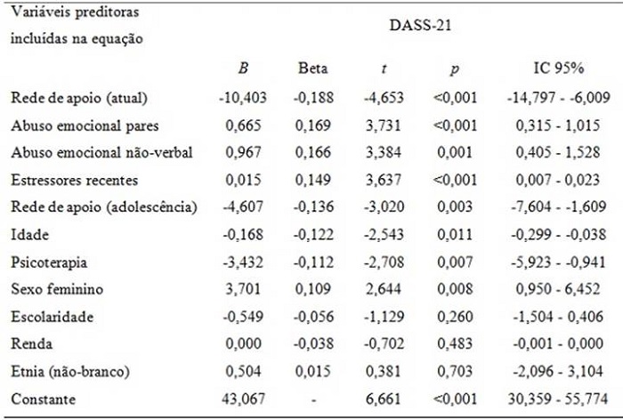 Já o modelo explicativo encontrado na análise de regressão, incluiu diversas variáveis que contribuem tanto negativa quanto positivamente com a alteração dos índices de sintomatologia internalizante. O modelo que melhor explicou esta relação incluiu menor percepção de rede de apoio na vida adulta, ter sofrido abuso emocional de pares e abuso emocional não-verbal parental na infância, maior índice de estressores recentes, menor percepção de rede de apoio social na adolescência, ser mais novo, não ter realizado psicoterapia, ser do sexo feminino, ter menor escolaridade, renda financeira média mais baixa e ser não-branco como variáveis independentemente associadas à maior sintomatologia de depressão, ansiedade e estresse. Ou seja, mesmo quando considerados diversos fatores proximais, as adversidades relacionadas a abuso psicológico ainda parecem provocar prejuízo sobre a saúde mental - mesmo anos depois do ocorrido. Esse modelo explicou 32,8% da variação nos índices de sintomatologia de depressão, ansiedade e estresse. Isso indica que outros fatores certamente estão implicados na apresentação dessa sintomatologia, além dos analisados neste artigo.