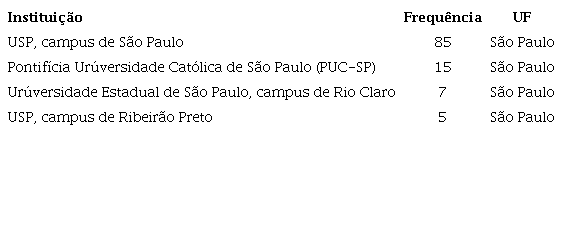 Dos 171 documentos analisados, não foi possível obtermos os nomes das instituições às quais autores de oito materiais estavam vinculados. Assim sendo, as informações foram obtidas a partir de 163 trabalhos nos quais encontramos 31 instituições brasileiras. Notamos, também, a pouca participação de instituições estrangeiras; somente em um trabalho foi localizado um autor ligado a instituição da França. Ao observarmos a Tabela 1, vemos as instituições com maiores ocorrências de publicação - novamente, considerando apenas a filiação institucional do primeiro autor. Quanto às instituições de maiores ocorrências, percebemos que elasse localizam na região Sudeste, especificamente, no estado de São Paulo. Isso pode se dever a um conjunto de fatores, um primeiro especificamente ligado à distribuição geográfica da ciência brasileira e um segundo, mais particular à Psicologia. No que tange ao primeiro aspecto, vemos maior concentração de instituições científicas nas regiões Sul e Sudeste ( Schwartzman, 2002). Este fenômeno, inclusive, pode ter relação com a concentração de renda oriunda das estruturas socioeconômicas produzidas na República Velha e fortalecidas na Era Vargas. Por exemplo, além da criação das agências federais de fomento à pesquisa, o estado de São Paulo criou, em 1960, a Fundação do Amparo à Pesquisa do Estado de São Paulo (FAPESP). No que se refere particularmente à Psicologia, podemos hipotetizar, pelo menos, duas possibilidades: (1) o fato do estado de São Paulo contar com a produção de práticas e conhecimentos psicológicos, de maneira institucionalizada, desde o início do século XX. Vemos, por exemplo, a criação do Gabinete de Psicologia e Antropologia da Escola Normal de São Paulo, em 1914 ( Centofanti, 2006; Tavares, 1996); e (2) o fato da cidade de São Paulo contar à época com, pelo menos, dois cursos de graduação em Psicologia, um na Faculdade de Filosofia, Ciência e Letras Sedes Sapientiae e outro na USP, o que tem relação com a produção de Psicologia institucionalizada, à época ( Antunes, 2004).