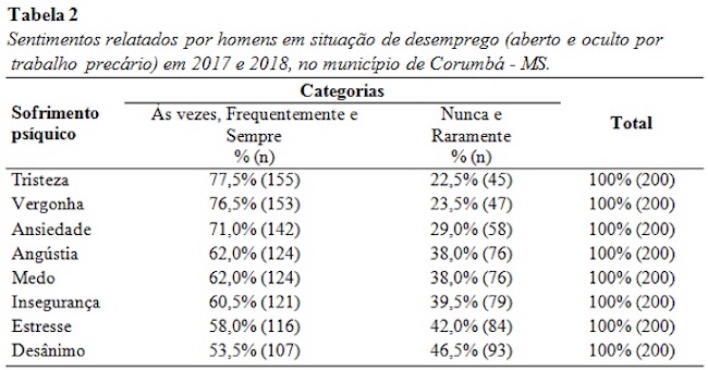 RESUMO: Este artigo identifica a presença de sofrimento psíquico e social em desempregados e analisa sentimentos e impactos decorrentes da busca frustrada por trabalho em Corumbá, Mato Grosso do Sul, Brasil. Realizou-se uma pesquisa transversal em 2017 e 2018 com 200 desempregados em curta e longa duração, os quais responderam a um questionário sóciodemográfico e à Escala de Avaliação de Sofrimento Psíquico-social de Trabalhadores Desempregados. Com idade média de 33 anos, 50,5% eram casados, 47,5% tinham ensino médio e 50% estavam em desemprego severo. Dos 46,5% com renda, apenas 10,5% recebiam seguro-desemprego, e 22,5% dos 60% informais não recebiam pagamento. Os principais sentimentos e eventos sociais relatados foram tristeza (77,5%), vergonha (76,5%), ansiedade (71,0%), dificuldade em fazer amizades (31,0%) e perda de confiança social (27,5%). Embora a análise conjunta dos dois fatores tenha apontado para o sofrimento em apenas 7,5%, a associação entre sofrimento psíquico e desemprego severo (p=0,002) demonstra a vulnerabilidade psíquica relacionada à situação de precarização.