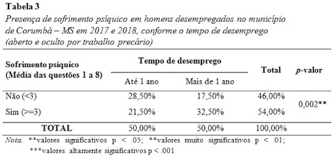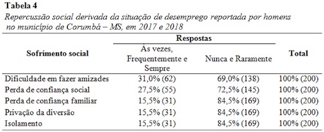 ABSTRACT: This paper identifies the presence of psychological and social suffering, and analyzes feelings and impacts derived from the unemployment situation in Corumbá, Mato Grosso do Sul, Brazil. A cross-sectional research was carried out in 2017 and 2018 in Corumbá, Mato Grosso do Sul, Brazil. The study included 200 short and long-term unemployed, who answered a sociodemographic questionnaire and the Psychosocial Suffering Scale of Unemployed Workers. With an average age of 33 years, 50.5% were married, 47.5% had high school and 50% were in severe unemployment. Of the 46.5% with income, only 10.5% were related to unemployment insurance, and 22.5% of the informal 60% did not receive payment. The main feelings and social events reported were sadness (77.5%), shame (76.5%), anxiety (71.0%), difficulty in making friendships (31.0%) and loss of social trust (27.5%). Although the joint analysis of the two factors pointed to suffering in only 7.5%, the association between psychological suffering and severe unemployment (p = 0.002) demonstrates the psychological vulnerability related to the precarious situation.