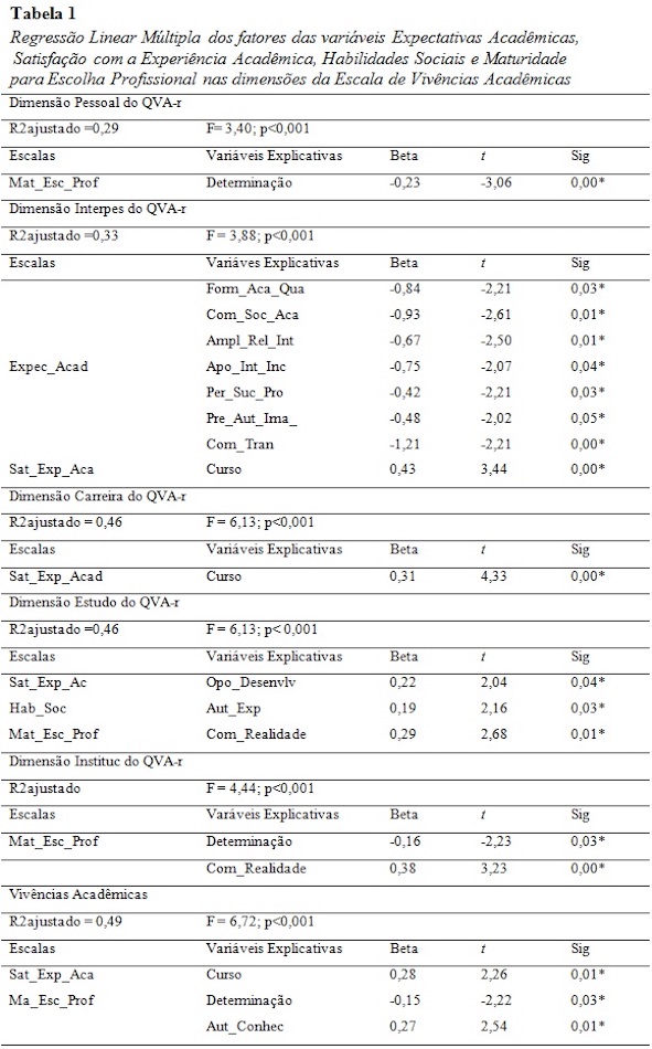 Observa-se na Tabela 1 a RLM das variáveis explicativas nas dimensões da variável critério. Para a primeira dimensão houve impacto negativo do fator Determinação que explicou 29% da variável pessoal. Na segunda dimensão verificou-se impacto negativo dos fatores da EAEES: Formação Acadêmica de Qualidade, Compromisso Social e Acadêmico, Ampliação das Relações Interpessoais, Oportunidade de Internacionalização e Intercâmbio, Perspectiva de Sucesso Profissional, Preocupação com a Autoimagem e Desenvolvimento de Competências Transversais. Houve impacto positivo do fator Curso da ESEA. O conjunto de variaveis explicou 33% da variável critério interpessoal. A variável Curso da EAEES impactou positivamente na dimensão Carreira, explicando 32% da variável. O fator Oportunidade de Desenvolvimento da ESEA, o fator Autoexposição a Desconhecidos e Situações Novas do IHS e o fator Conhecimento da Realidade Profissional da EMEP impactaram positivamente na variável critério estudo. O conjunto dessas variáveis explicou 46% da variável critério. O fator Determinação da EMEP apresentou impacto negativo e o Conhecimento da Realidade Profissional também da EMEP apresentou impacto positivo na variável critério Institucional. O conjunto de variáveis explicou 37% da variável critério Institucional. Para o escore geral das Vivências Acadêmicas identificou-se um impacto positivo no fator Curso da ESEA e do fator Autoconhecimento da EMEP e impacto negativo no fator Determinação. O conjunto de variáveis explicou 49% da variável critério vivências acadêmicas.