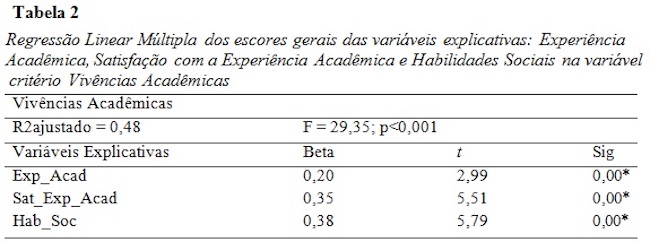 Na Tabela 2, as variáveis Expectativas Acadêmicas, Satisfação com Experiências Acadêmicas e Habilidades Sociais impactaram positivamente explicando 48% da variável critério.