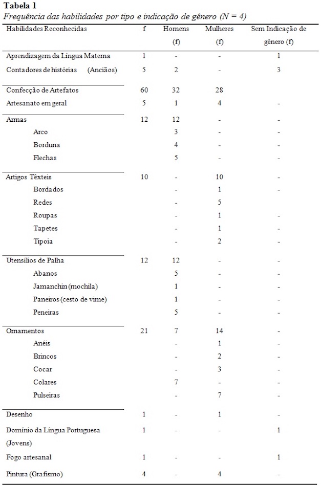 As habilidades masculinas estavam mais voltadas para a confecção de artefatos utilizados na caça, pesca e armas de guerra como: arco, flecha, bordunas, cocares e objetos confeccionados com palhas como peneiras, abanos, paneiros e cestos. As mulheres, por sua vez, dedicavam-se aos ornamentos (colares, brincos, anéis e grafismos) e produtos têxteis (redes, tipoias e vestimentas). Maiores detalhes sobre as habilidades e sua divisão por gênero e tipo podem ser visualizados na Tabela 1.