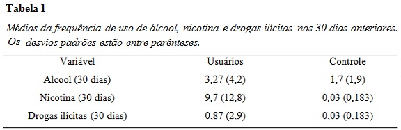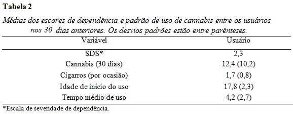 A amostra foi constituída por alunos de graduação maiores de 18 anos da Universidade Federal de Pernambuco. A amostragem de conveniência (não-aleatória) incluiu 30 participantes usuários de cannabis e 30 participantes não usuários. Não houve cálculo do tamanho amostral. Os participantes eram de curso de diversas áreas (sociais, humanas, saúde). Com relação aos dados sociodemográficos, no grupo de usuários, 17 foram do sexo masculino e 13 do sexo feminino. Já no grupo de não-usuários, 18 foram do sexo masculino e 12 do sexo feminino, com idade média de 22 anos em ambos os grupos (desvio-padrão de 2,2 entre os usuários e de 4,1 no grupo-controle). O resumo dos dados sobre o uso de álcool, nicotina e drogas ilícitas para os dois grupos são apresentados na Tabela 1. Os participantes usaram cannabis, em média, em 12,86 ocasiões nos últimos trinta dias com uma média de 1,76 cigarros por ocasião, indicando um padrão de uso moderado. A idade média do início do uso foi de 17,79 anos, com o tempo médio desde que iniciou o uso sendo de 4,2 anos, como podese observar na Tabela 2.