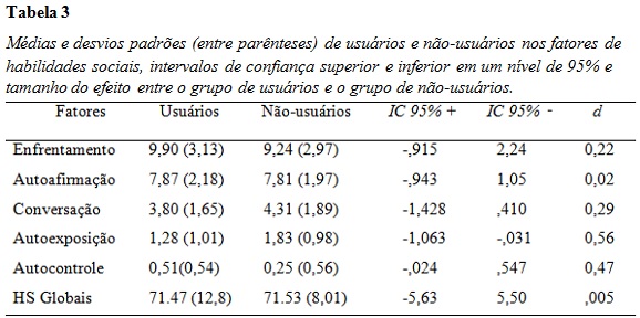 Para a investigação de possíveis diferenças no repertório de HS de usuários e nãousuários de cannabis, realizou-se uma análise comparativa entre os grupos. Inicialmente, em relação aos dados normativos do instrumento (Z. A. P. Del Prette & A. Del Prette, 2001), observou-se que tanto o grupo de usuários como o de não-usuários apresentaram um bom repertório de HS. Os escores de ambos os grupos foi acima da mediana nos fatores Enfrentamento, Autoafirmação e Conversação e abaixo da mediana em Autoexposição e Autocontrole. O escore global indicou bom repertório de HS, sendo abaixo da mediana, para ambos os grupos. Na Tabela 3 podemos observar os resultados descritivos nos grupos e os resultados das estatísticas inferenciais.