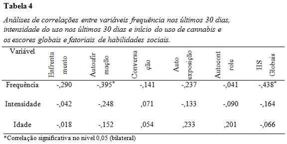 Nos resultados, encontraram-se relações significativas negativas fracas dos fatores Autoafirmação (r =-0,39; p < 0,05) e Habilidades Sociais Globais (r =-0,44, p < 0,05) com a frequência do uso nos últimos trinta dias. Não se encontraram relações significativas estatisticamente entre os demais fatores (p > 0,05), como poder ser observado na Tabela 4.