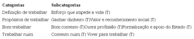 O trabalhar representa um esforço que impede a vida (T), como nos exemplos: “A gente não trabalha para viver. A gente vive para trabalhar” (José) e “Você trabalha muito para conseguir viver e você não vive” (Ana). Uma subcategoria R emergiu da narrativa de George trazendo uma definição particular interessante ao dizer que trabalhar “é o meio pelo qual posso realizar uma atividade na sociedade e contribuir com o sustento da minha família”, marcando o trabalhar como a busca do bem-comum.