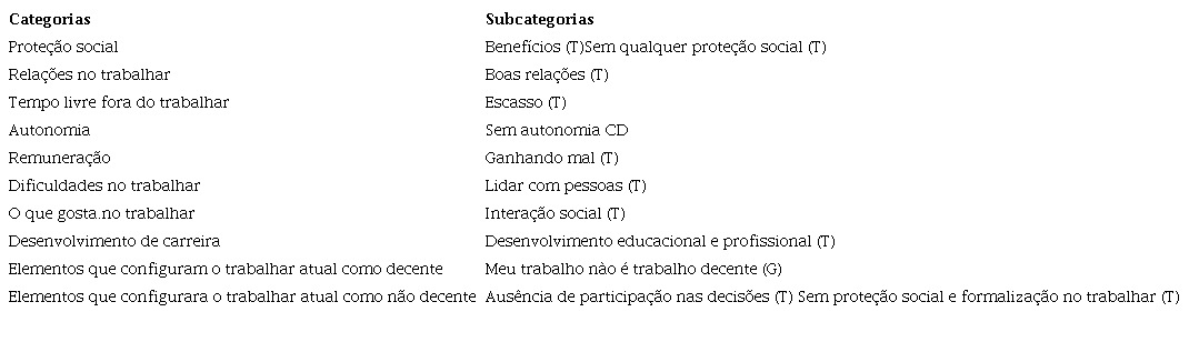 Apresentamos os resultados a partir das categorias e subcategorias construídas relativas às quatro dimensões da experiência dos/as participantes ligadas ao trabalho decente definidas pela pesquisa (vide Tabelas 1, 2, 3 e 4). Com base em Hill et al. (1997), classificamos as categorias como gerais, quando se aplicavam a 18-20 casos; típicas, quando se aplicavam a 12-17 casos; variantes, quando se aplicavam a 5-11 casos; e raras, até 4 casos, sendo que apresentamos apenas as subcategorias gerais e típicas de cada categoria definida e as indicamos, respectivamente, pelas letras G e T. Incluímos na análise algumas subcategorias raras que traziam algum dado relevante para a discussão e as representamos pela letra R.