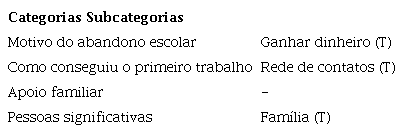 Os/as participantes apontaram ganhar dinheiro como principal motivo para abandonar a escola, como explicou José: “Acho que a escola não oferecia muita ajuda para quem tem que trabalhar e tem que estudar”. A questão da gravidez também apareceu como R na narrativa de duas participantes ao relatarem a dificuldade de cuidar de um/a filho/a e estudar: “Eu saí da escola porque engravidei. Aí não tinha como ficar indo para escola, porque não tinha alguém para ficar com ela (filha) e eu poder voltar para escola” (Marta), destacando uma questão de gênero central. Como conseguir o primeiro emprego se dava, basicamente, por meio da rede de contatos: “Aí foi quando o Rui me falou do trabalho, eu comecei a trabalhar” (Ana). O apoio familiar foi categorizado como R e família apareceu como indicação básica de pessoas significativas, como apontou Antônio: “Acho que de certa forma é uma base, né?