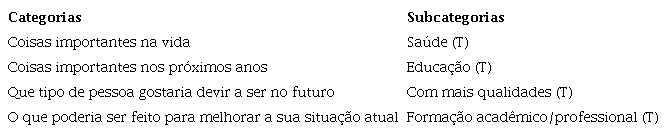 Os/as participantes falaram da saúde como T para coisas importantes na vida, como ilustrou Marco: “Hoje em dia nós convivemos com uma coisa chamada quantidade, e a gente se esquece da qualidade.” Em termos de coisas importantes nos próximos anos e como melhorar a sua situação atual, os/as participantes apontaram a educação e a formação acadêmico/profissional, “preciso voltar a estudar, se não, não vai dar” (Maria), e que precisavam de mais qualidades, “pretendo ser uma pessoa mais bem estruturada” (Antônio).