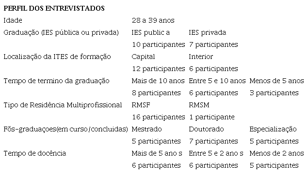 Foram entrevistados 17 psicólogos(as) egressos(as) das RMS do Ceará com experiência em docência. Foi possível observar que são professores jovens (28 a 39 anos); em sua maioria, formados há mais de 10 anos em IES públicas e privadas da capital do Estado; com pós-graduação stricto sensu concluída ou em andamento; e com tempo de docência variando entre mais de cinco anos e menos de 2 anos (Tabela 1).