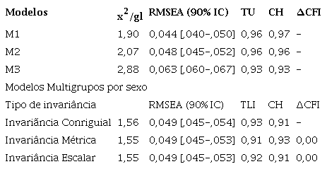 Todos os modelos testados apresentam indicadores aceitáveis de ajuste. Entre eles, constata-se que M1 e M2 apresentaram indicadores mais adequados e favoráveis da ferramenta na amostra brasileira. Já M3, apresentou indicadores positivos e um índice de ajuste RMSEA mais elevado que os dois outros modelos. Adicionalmente, destaca-se a natureza de invariância do modelo original (M1) em relação à variável sexo (homens e mulheres) nos aspectos configural, métrico e escalar. Na Tabela 2 é possível verificar as estatísticas descritivas e os indicadores de precisão do tipo Ômega (ω) para as estruturas testadas em M1 e M2.