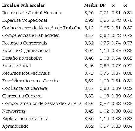Como observado na Tabela 2, os coeficientes alfa de Cronbach ordinal e Ômega de McDonald foram estimados para as 12 subescalas representando os recursos de carreira separadamente (por exemplo, envolvimento com a carreira), e para as quatro subescalas que agrupam esses fatores, representando as dimensões de segunda ordem (por exemplo, recursos de capital humano). Entre os 12 fatores, os valores de ω variaram entre 0,78 e 0,90, sendo considerados bons e ótimos, com exceção do fator denominado Desafio (ω = 0,49). Para as quatro dimensões, os valores foram entre 0,78 e 0,89. Cabe destacar ainda que os valores α de Cronbach ordinal mostraram-se similares aos do coeficiente Ômega de McDonald.