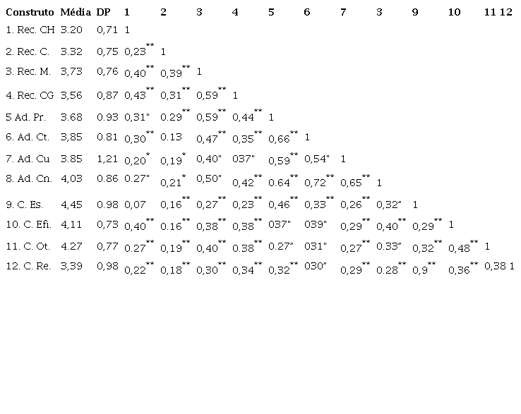 Aspectos de evidências convergentes do CRQ-S foram explorados a partir do Modelo 2, contendo as dimensões hierárquicas de recursos de carreira (recursos de capital humano de carreira; recursos contextuais de carreira; recursos motivacionais de carreira e comportamentos de gestão da carreira). As dimensões do questionário de recursos foram correlacionadas com variáveis de capital psicológico, e adaptabilidade de carreira. A Tabela 3 apresenta os coeficientes de correlação de Pearson entre os construtos.