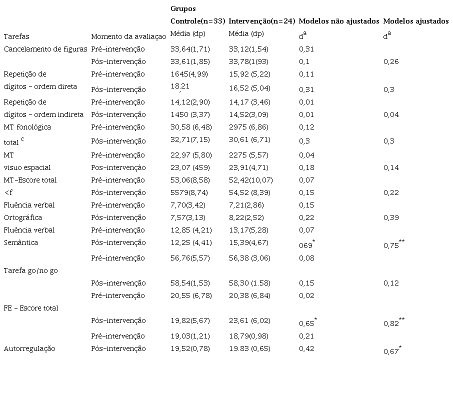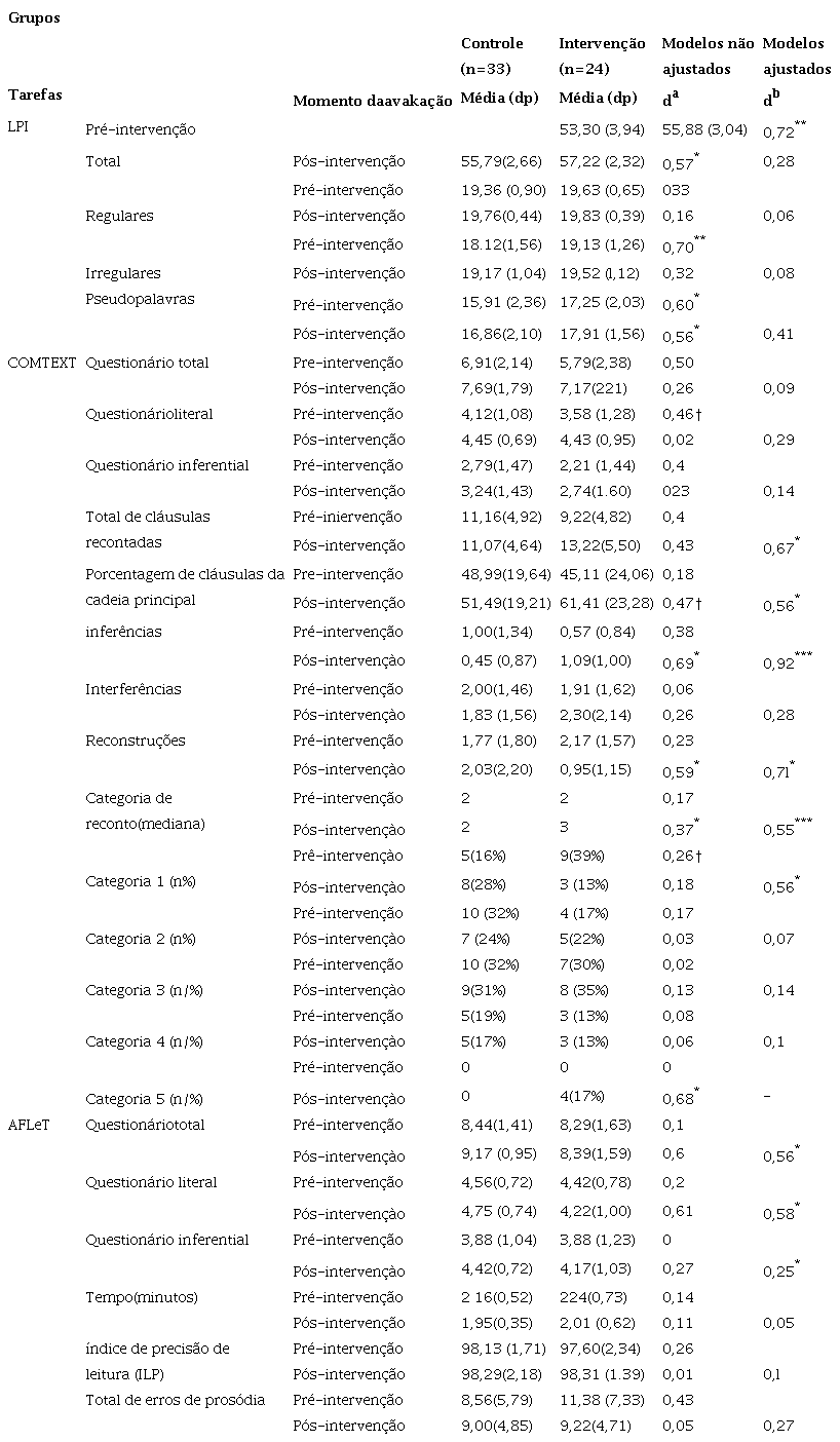 A Tabela 2 apresenta as médias e desvios-padrão em tarefas de leitura e a Tabela 3 em tarefas neuropsicológicas dos dois grupos no pré- e pós-teste, bem como as diferenças entre grupos no pré-teste e no pós-teste antes e depois do ajuste por pré-teste e covariáveis. Não houve diferença estatisticamente significativa entre os grupos controle e intervenção no préteste, exceto para LPI escore total, LPI irregulares e LPI pseudopalavras, para os quais o grupo intervenção apresentou escores mais elevados. As diferenças entre os grupos intervenção e controle no pós-teste foram observadas para LPI total, LPI pseudopalavras, inferências e reconstruções, questionário AFLeT total e literal e para os testes de FE fluência semântica e FE total. Após ajuste de escores no pré-teste, o grupo intervenção também apresentou escores mais altos em COMTEXT total de cláusulas recontadas, porcentagem da cadeia principal, categorias do reconto (total e especificamente a 1 e a 5) e autorregulação comparado ao grupo controle. Entretanto, após tal ajuste, os efeitos da intervenção sobre LPI total e LPI pseudopalavras não permaneceram significativos, provavelmente devido às diferenças existentes no pré-teste. Os TE variaram de médio a alto (0,55 a 0,92).
