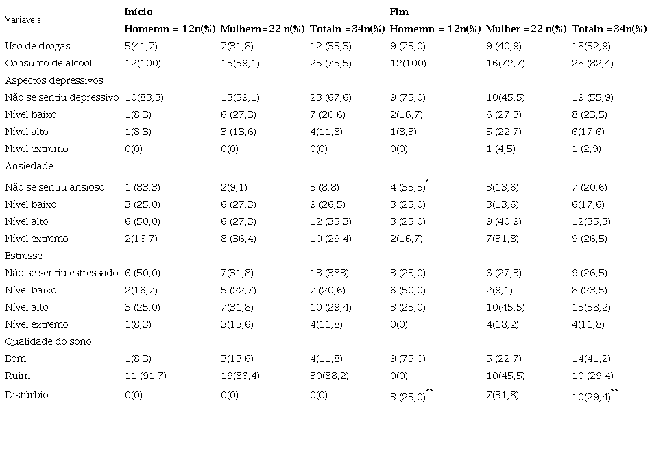 Os dados em relação ao estresse revelaram que 61,8% dos estudantes se autoperceberam nessa condição nos últimos sete dias no início e aumento ao final do curso (73,5%), principalmente no nível baixo para os homens e os níveis alto e extremo para as mulheres, mas sem significância (p > 0,5).