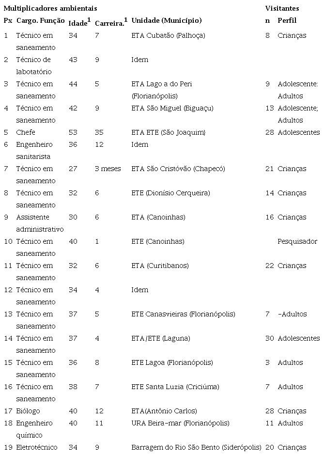 Participaram da pesquisa 19 multiplicadores ambientais que atuam diretamente ou em suporte às Estações de Tratamento de Água (ETA) e Esgoto (ETE) e barragem de captação de água. A educação ambiental é constituída de dois conjuntos de ações: quando representantes vão a instituições para palestras e apresentações, mais próximo de atividades formais; e quando visitantes vão às unidades operacionais guiados por um representante da companhia. O foco da presente pesquisa se deu com os multiplicadores ambientais que realizam o segundo conjunto de atividades, com características de educação ambiental não formal.