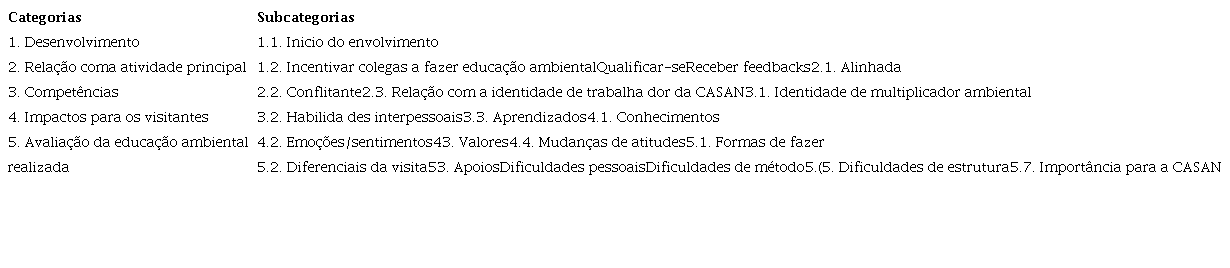 A partir da análise de conteúdo das entrevistas com os participantes, realizada pela codificação aberta, axial e seletiva dos dados, foram estabelecidas as seguintes categorias: desenvolvimento, relação com a atividade principal, competências, impactos para os visitantes e avaliação a educação ambiental realizada. Cada categoria contou com subcategorias específicas, conforme a Tabela 2. Os elementos de análise obtidos permitiram caracterizar os participantes como multiplicadores ambientais e compreender as atividades realizadas à luz da discussão sobre o modelo de educação ambiental emancipatória, bem como as relações com os locais e pessoas envolvidas com as atividades. A seguir as categorias são discutidas.