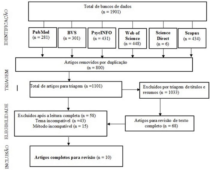 Foram encontrados inicialmente 1901 artigos. Após aplicação dos critérios de inclusão e exclusão restaram 10 artigos para inclusão e análise nos resultados desta revisão. A Figura 1 ilustra como foi o processo de busca e tratamento dos artigos.