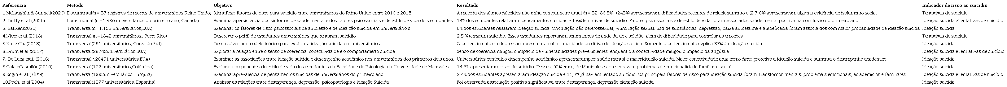 A Tabela 1 resume os dez estudos usados na análise. Nela consta método e objetivo de cada pesquisa, resultados alcançados, os fatores de risco ao suicídio e as comorbidades associadas aos estressores acadêmicos. Em geral, os estudos foram desenvolvidos seguindo método transversal e quasi-experimental, cujos resultados apontam, na sua maioria, que os estressores acadêmicos geram sofrimento e estão associados a aumentos no risco de ideação e tentativas de suicídio.