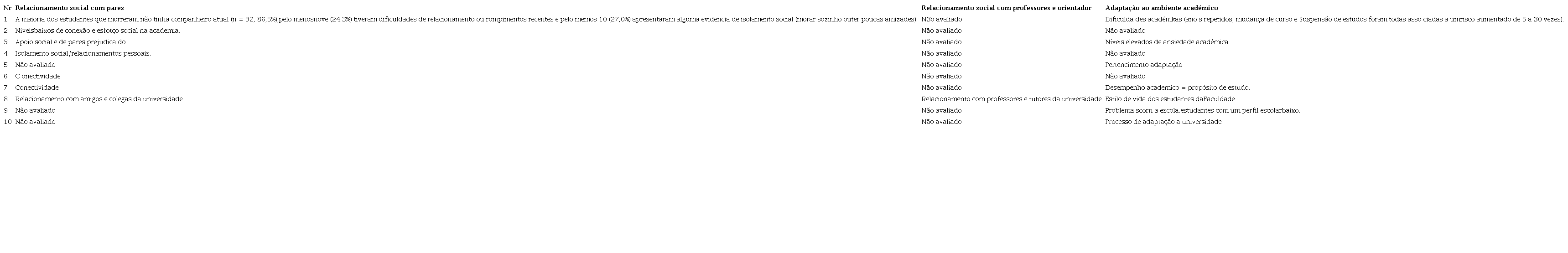 A partir da análise criteriosa dos 10 artigos incluídos, os principais fatores acadêmicos associados a ideação e tentativas de suicídio foram agrupados em três categorias para a apresentação e discussão dos resultados: 1) relacionamento social com pares; 2) relacionamento social com professores e orientador; e 3) adaptação ao ambiente acadêmico (Tabela 2). Ademais, os artigos abordam ainda fatores ambientais extra-acadêmicos (e.g. suporte familiar inseguro, falta de afiliação religiosa ou partidária, vulnerabilidade socioeconômica) e fatores psicopatológicos (e.g. transtornos de ansiedade e depressão). Contudo, a análise destes fatores extra-acadêmicos não foi o objetivo do presente estudo.