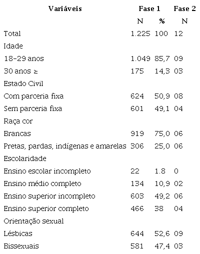 A amostra da fase 1 (quantitativa) foi composta por 1.225 mulheres que se auto identificaram como lésbicas ou bissexuais, sendo não probabilística e por conveniência. Os critérios de inclusão na amostra foram: referir relações sexuais com mulheres, ter mais de dezoito anos de idade e residir no Brasil.