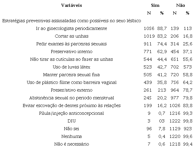 Apenas 0,4% da amostra da fase 1 relatou que nenhuma estratégia seria possível (Tabela 2) e 0,6% que estes não seriam necessários. Nesta direção, a não adoção de estratégias preventivas foi relatada nas entrevistas. Uma das participantes reconheceu isto, não só na sua experiência, como também na de mulheres lésbicas e bissexuais próximas: