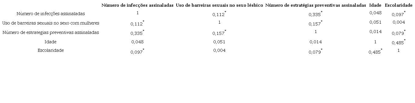 O teste de correlação de Pearson (Tabela 3) indicou correlações significativas entre o resultado da percepção de risco (número de infecções assinaladas como possíveis de transmissão no sexo lésbico) e o conhecimento sobre estratégias preventivas ao sexo lésbico (número de estratégias de prevenção corretamente referidas), uso de barreiras sexuais nas relações sexuais lésbicas, idade e o grau de escolaridade da amostra da fase 1. Assim, as participantes que se perceberam mais em risco para um maior número de infecções, também identificaram mais alternativas de prevenção e fizeram maior uso de barreiras sexuais com mulheres. Em relação à escolaridade, quanto mais anos de estudo, maior foi a percepção de risco e conhecimento sobre estratégias preventivas. No entanto, escolaridade não foi um indicador significativo no uso de barreiras sexuais com mulheres. A idade não foi significativa na análise.