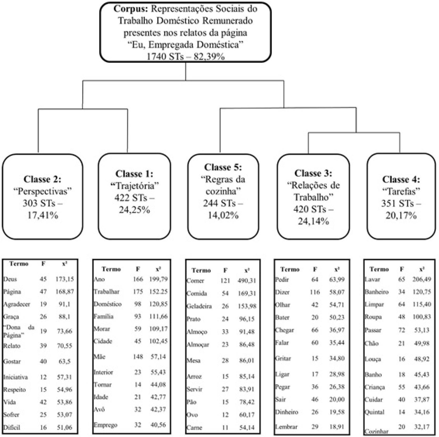 RESUMO: Este estudo documental objetivou analisar as representações sociais sobre o trabalho doméstico remunerado compartilhadas na página do Facebook “Eu, Empregada Doméstica” e as práticas sociais delas decorrentes. Para tanto, foram coletados 276 relatos, que compuseram o corpus submetido a uma Classificação Hierárquica Descendente no software Interface de R pour les Analyses Multidimensionnelles de Textes et de Questionnaire (IRaMuTeQ). Os resultados indicaram a existência de cinco classes, denominadas: “Perspectivas”, “Trajetórias”, “Regras da Cozinha”, “Relações de Trabalho” e “Tarefas”. As análises demonstraram haver um dissenso representacional, caracterizado pelo confronto de uma perspectiva negativa sobre a profissão, em que as regras, as tarefas e as relações interpessoais estabelecidas eram marcadas por práticas de violência, e outra de caráter positivo, que consistia na afirmação identitária e na busca de uma realidade distinta da vivenciada enquanto trabalhadora doméstica. Concluiu-se, então, que os relatos divulgados retratam a disputa entre representações sociais hegemônicas, associadas ao cotidiano de trabalho, e representações sociais de oposição, manifestadas nas denúncias expostas pelas profissionais na rede social, sinalizando a presença de um movimento, em espaço digital, que visa transformar a realidade ainda negativa da profissão.