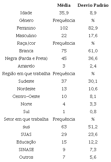 Na Tabela 1, temos as características sociodemográficas das(os) respondentes. A idade média das(os) profissionais é de 35,9 anos (DP = 8,9). A maioria (82,9%) se identificou com o gênero feminino. Quanto à raça, a maioria se declarou branca(o) (61,0%); 36,6% negra(o) (parda/o ou preta/o) e o restante, amarela(o) (2,4%). O setor de atuação predominante é o de saúde (SUS), com mais da metade das(os) profissionais entrevistados (51,2%), seguido do campo da assistência social, o SUAS (23,6%). Participaram profissionais de todas as regiões, mas com predomínio do Sudeste (30,1%). Aproximadamente metade possuía pós-graduação lato sensu (especialização) e um pouco mais de um quarto pós-graduação stricto sensu (mestrado e doutorado).